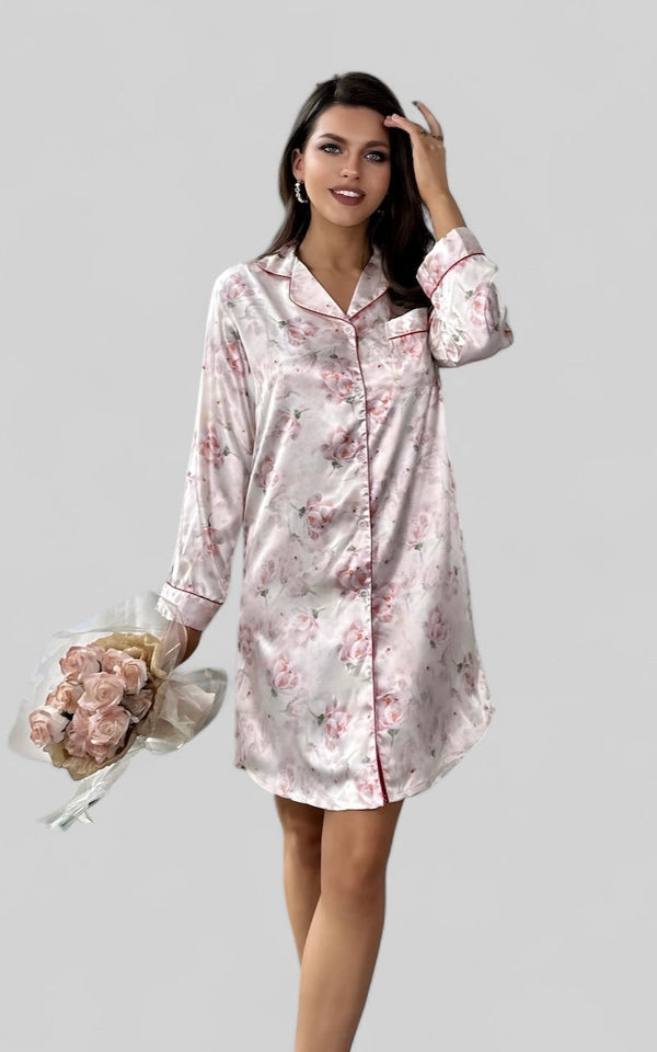 Chemise de nuit satinée à imprimé floral élégant Caractér...