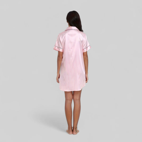 Chemise de nuit satinée rose à rayures et col classique
