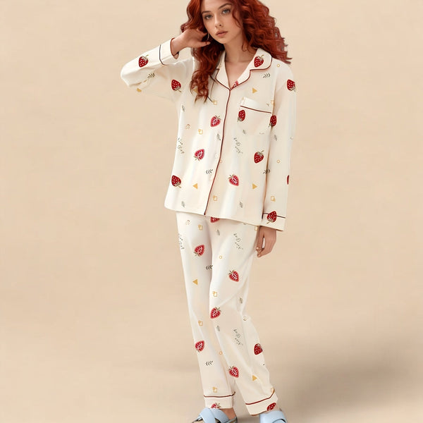 Pyjama femme en coton imprimé fraises – Ensemble cardigan à manches longues avec pantalon taille élastique