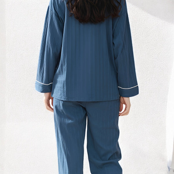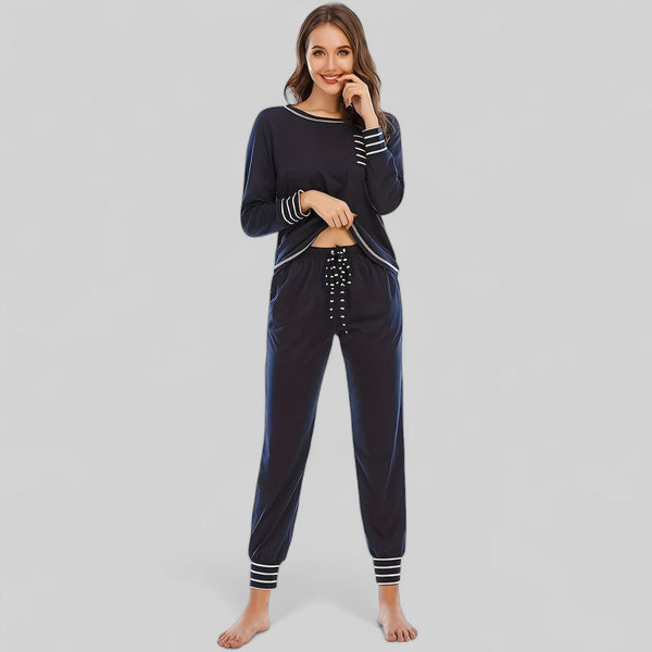 Pyjama bleu marine en coton pour femme avec manches longues et détails rayés