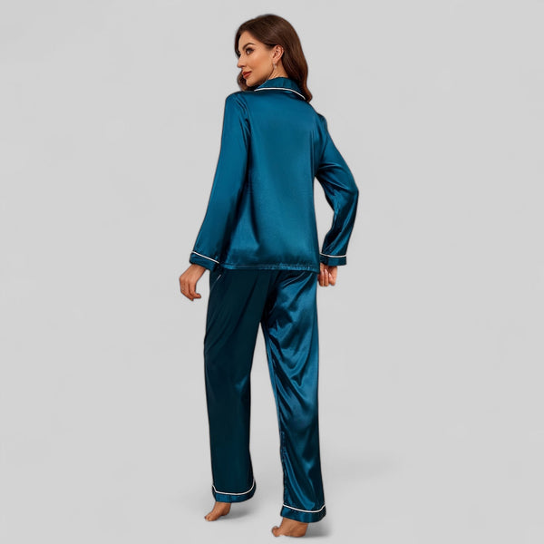 Pyjama satin bleu femme - Ensemble manches longues avec col à revers
