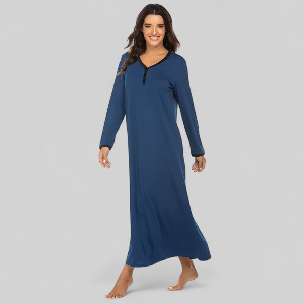 Robe de nuit longue bleu marine à col en V et manches longues