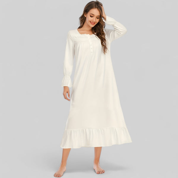 Robe de nuit longue en coton blanc avec manches longues et détails boutonnés