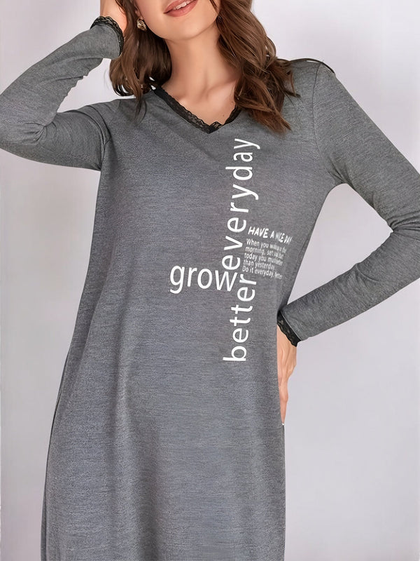 Robe de nuit longue en coton gris avec imprimé, manches longues et col en V